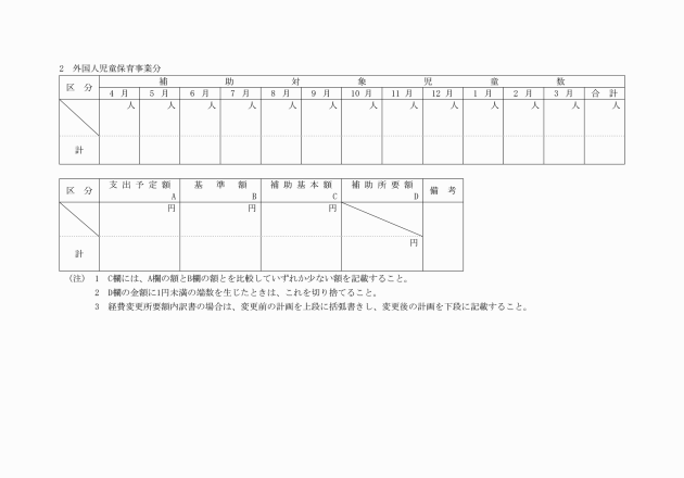 2 外国人児童保育事業 | 社会福祉法人等が行う外国人児童保育事業に要する人件費(保育する児童が10人以上の保育所に限る。)、研修費、教材費及び通信連絡費について要する経費 | 各月初日現在の外国人児童数に応じ、次の表の区分によって定まる額の年間合計額 | 基準額と補助対象経費の実支出額とを比較していずれか少ない額以内 | ||||||