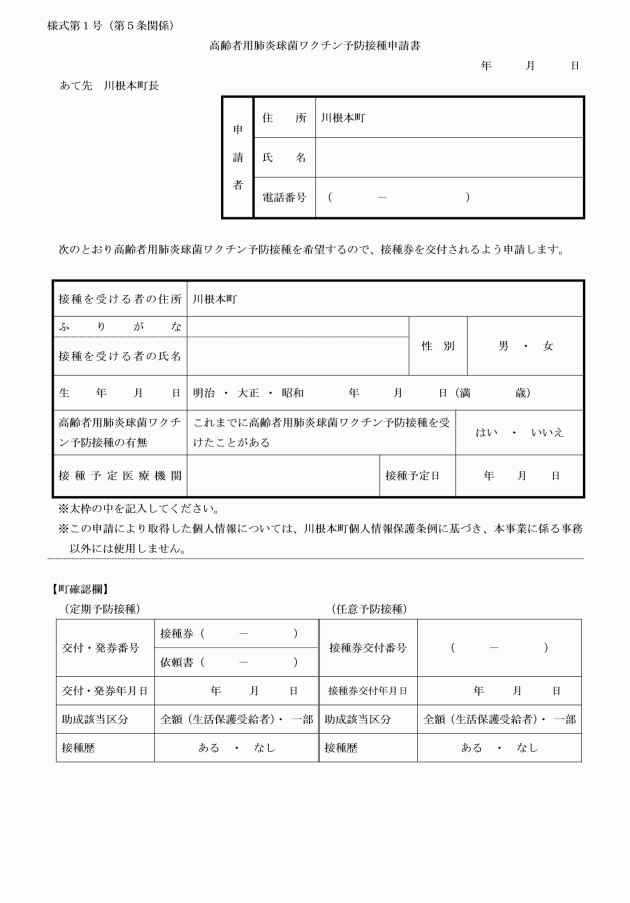 第5条 予防接種を希望する対象者(以下「申請者」という。)は、あらかじめ高齢者用肺炎球菌ワクチン予防接種申請書(様式第1号)を町長に提出しなければならない。