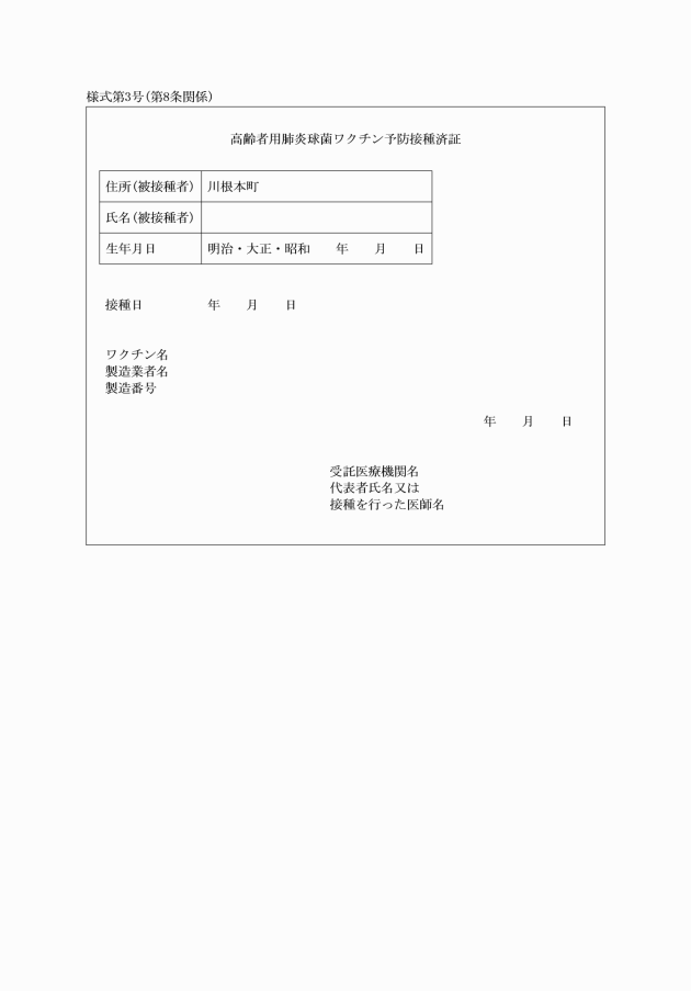 第8条 受託医療機関は、予防接種を受けた者に対し、高齢者用肺炎球菌ワクチン予防接種済証(様式第3号)を交付するものとする。