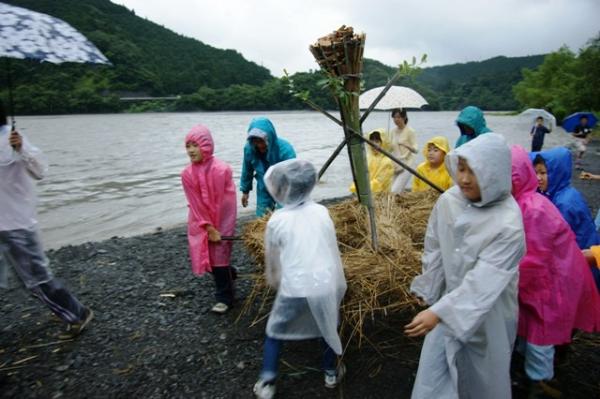 あいにくの雨模様の中、瀬平地区の住民約80人と中川根南部小学校4年生12人が午後5時に大井川河川敷に集まった。