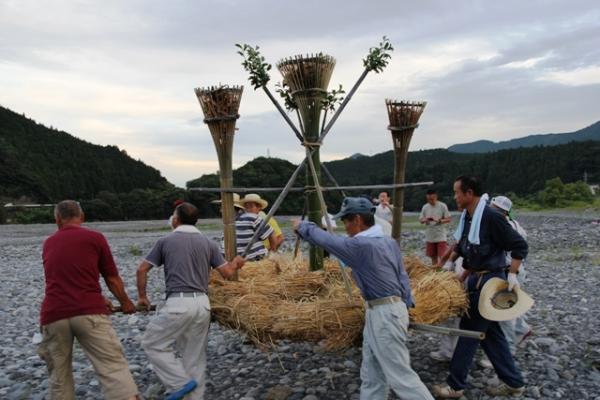 麦わらを編んで土台を作り、青竹で骨格を組みながら「たい」と呼ばれる直径約3メートルほどの台座を作り、その上に青竹の先端部分を短冊状に裂き作った「たいまつ」を立てる。