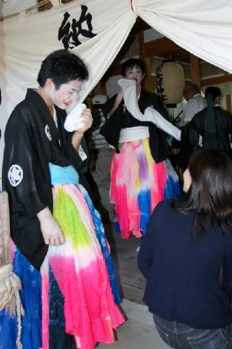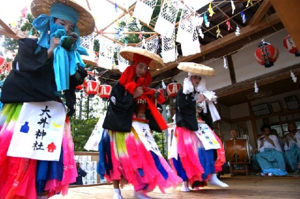 現在では3年に1度、例大祭の9月15日に大井神社で奉納されています。演目や全体の構成は他に類を見ない独特なものといえます。